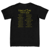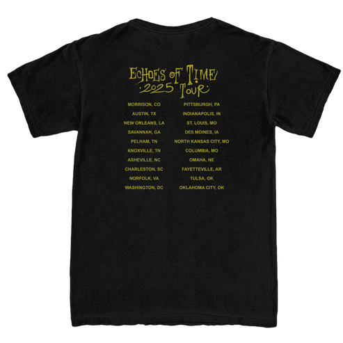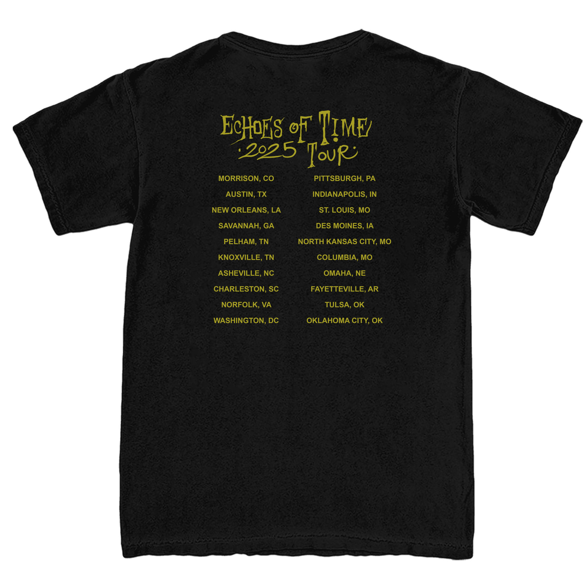 Echoes of Time mushroom tour tee in black with FALL DATES on the back.
